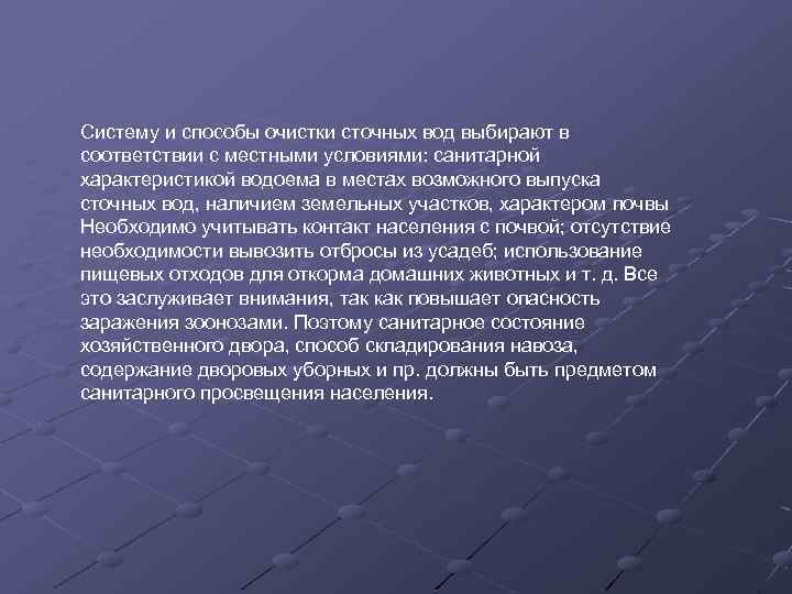 Систему и способы очистки сточных вод выбирают в соответствии с местными условиями: санитарной характеристикой водоема в местах возможного выпуска сточных вод, наличием земельных участков, характером почвы Необходимо учитывать контакт населения с почвой; отсутствие необходимости вывозить отбросы из усадеб; использование пищевых отходов для откорма домашних животных и т. д. Все это заслуживает внимания, так как повышает опасность заражения зоонозами. Поэтому санитарное состояние хозяйственного двора, способ складирования навоза, содержание дворовых уборных и пр. должны быть предметом санитарного просвещения населения.