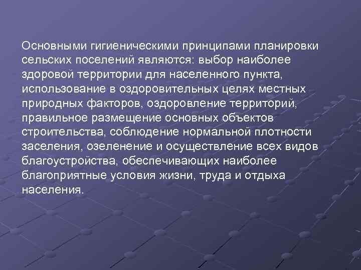 Основными гигиеническими принципами планировки сельских поселений являются: выбор наиболее здоровой территории для населенного пункта, использование в оздоровительных целях местных природных факторов, оздоровление территорий, правильное размещение основных объектов строительства, соблюдение нормальной плотности заселения, озеленение и осуществление всех видов благоустройства, обеспечивающих наиболее благоприятные условия жизни, труда и отдыха населения.