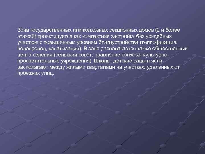 Зона государственных или колхозных секционных домов (2 и более этажей) проектируется как компактная застройка без усадебных участков с повышенным уровнем благоустройства (теплофикация, водопровод, канализация). В зоне располагается также общественный центр селения (сельский совет, правление колхоза, культурнопросветительные учреждения). Школы, детские сады и ясли располагают между жилыми кварталами на участках, удаленных от проезжих улиц.