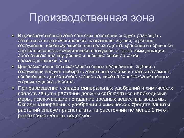 Производственная зона В производственной зоне сельских поселений следует размещать объекты сельскохозяйственного назначения: здания, строения, сооружения, использующиеся для производства, хранения и первичной обработки сельскохозяйственной продукции, а также коммуникации, обеспечивающие внутренние и внешние связи объектов производственной зоны. Для размещения сельскохозяйственных предприятий, зданий и сооружений следует выбирать земельные участки и трассы на землях, непригодных для сельского хозяйства, либо на сельскохозяйственных угодьях худшего качества. При размещении складов минеральных удобрений и химических средств защиты растений должны соблюдаться необходимые меры, исключающие попадание вредных веществ в водоемы. Склады минеральных удобрений и химических средств защиты растений следует располагать на расстоянии не менее 2 км от рыбохозяйственных водоемов