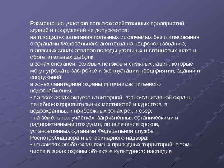 Размещение участков сельскохозяйственных предприятий, зданий и сооружений не допускается: на площадях залегания полезных ископаемых без согласования с органами Федерального агентства по недропользованию; в опасных зонах отвалов породы угольных и сланцевых шахт и обогатительных фабрик; в зонах оползней, селевых потоков и снежных лавин, которые могут угрожать застройке и эксплуатации предприятий, зданий и сооружений; в зонах санитарной охраны источников питьевого водоснабжения; - во всех зонах округов санитарной, горно-санитарной охраны лечебно-оздоровительных местностей и курортов, в водоохранных и прибрежных зонах рек и озер; - на земельных участках, загрязненных органическими и радиоактивными отходами, до истечения сроков, установленных органами Федеральной службы Роспотребнадзора и ветеринарного надзора; - на землях особо охраняемых природных территорий, в том числе в зонах охраны объектов культурного наследия