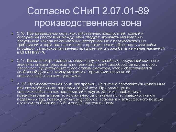Согласно СНи. П 2. 07. 01 -89 производственная зона 3. 16. При размещении сельскохозяйственных предприятий, зданий и сооружений расстояния между ними следует назначать минимально допустимые исходя из санитарных, ветеринарных и противопожарных требований и норм технологического проектирования. Плотность застройки площадок сельскохозяйственных предприятий должна быть не менее указанной в СНи. П II-97 -76. 3. 17. Линии электропередачи, связи и других линейных сооружений местного значения следует размещать по границам полей севооборотов вдоль дорог, лесополос, существующих трасс с таким расчетом, чтобы обеспечивался свободный доступ к коммуникациям с территории, не занятой сельскохозяйственными угодьями. 3. 18*. Производственная зона, как правило, не должна пересекаться железными или автомобильными дорогами общей сети. При размещении сельскохозяйственных предприятий и других объектов необходимо предусматривать меры по исключению загрязнения почв, поверхностных и подземных вод, поверхностных водосборов, водоемов и атмосферного воздуха с учетом требований п. 3. 6* и разд. 9 настоящих норм