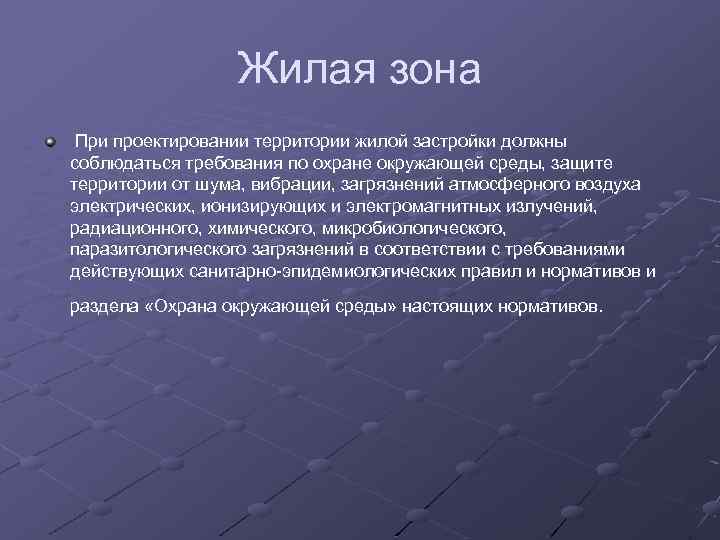 Жилая зона При проектировании территории жилой застройки должны соблюдаться требования по охране окружающей среды, защите территории от шума, вибрации, загрязнений атмосферного воздуха электрических, ионизирующих и электромагнитных излучений, радиационного, химического, микробиологического, паразитологического загрязнений в соответствии с требованиями действующих санитарно-эпидемиологических правил и нормативов и раздела «Охрана окружающей среды» настоящих нормативов.