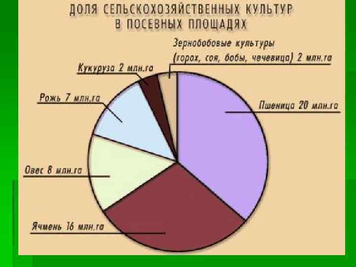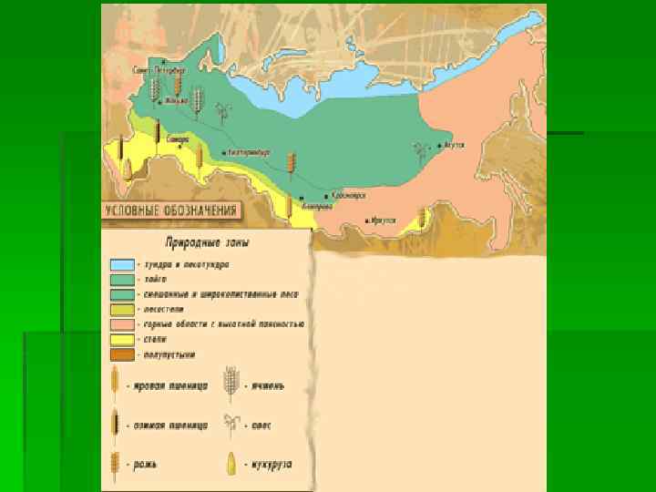 ПШЕНИЦА § Основная зерновая культура — пшеница — высевается на плодородных землях в лесостепной и степной зонах. В Поволжье, на юге Урала и в Сибири сеют яровую пшеницу и только в Центрально. Черноземном районе и на Северном Кавказе, где более мягкие зимы — более урожайную озимую, которую высевают осенью (под зиму).