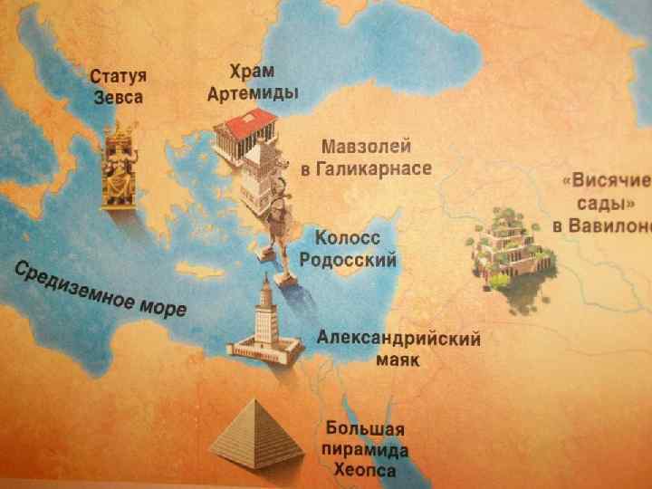 Семь памятников скульптуры и архитектуры, известные как семь чудес света, были созданы между 2550 г. до н. э. Их красота вызывала всеобщее восхищение. До нашего времени дошли только египетские пирамиды в Гизе, в том числе Большая пирамида Хеопса. Список семи чудес света составили греки, поскольку эти памятники находились в странах, завоёванных греческим полководцем Александром Македонским в IV в. до н. э.