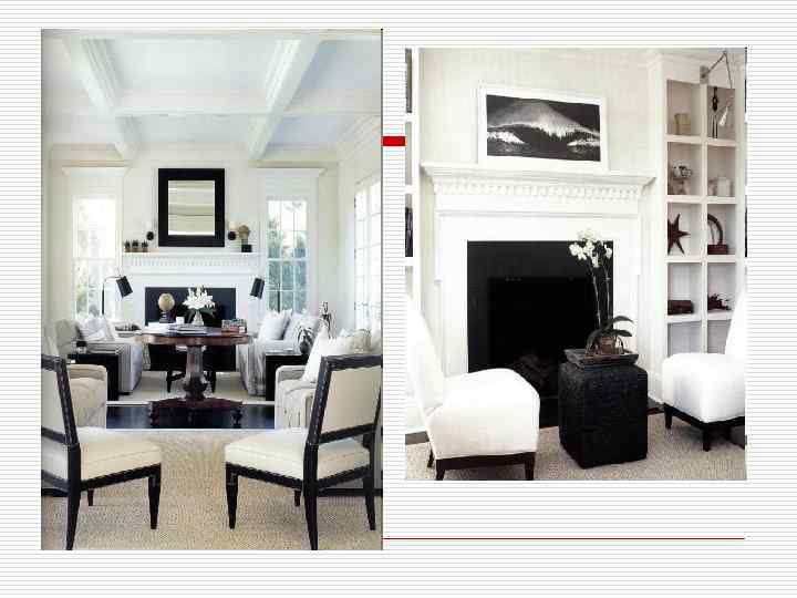 Рекомендации o • Чтобы избежать безжизненной старомодности, располагайте все цвета непринужденно и с фактурным разнообразием. o • Оттеняйте белый колорит перламутром и зеркалами. o • Для создания различных комбинаций используйте кремовые льняные ткани разных оттенков и плетений. o • Один из самых потрясающих эффектов – беленый лен, оттененный черной кожей, а также сочетания льна с натуральным тростником или с лакированным окрашенным бамбуком. Необычно и современно выглядит покраска и лакировка деревянных полов, особенно если пол набирается из старого шероховатого дерева. o • Выцветшие кремовые или сероватые тона создадут впечатление летнего пляжного домика. o • Очень красивым напольным покрытием являются монгольские ковры из овечьего меха. Особенно хорошо они выглядят на половицах богатых темных оттенков. o Основной эффект этого простого белого Источник: remstd. ru интерьера заключается в контрасте светлого и темного. Привлекательность помещению придают коллекция предметов, располагающаяся во встроенных полках, сдержанная обивка мебели, а также высокая белая каминная полка с фотографией.