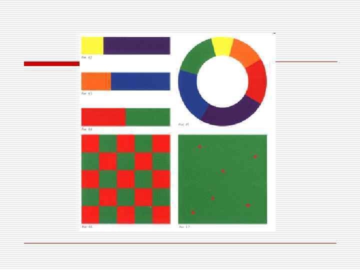 Как показано на рисунке 42… 44, для гармоничных соотношений плоскостей, заполненных дополнительными цветами, характерны следующие пропорции: o жёлтый: фиолетовый = 1/4: 3/4 o оранжевый: синий = 1/3: 2/3 o красный: зелёный = 1/2: 1/2
