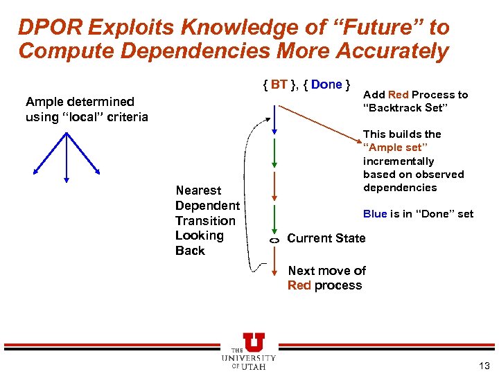 POR in the presence of Wildcards… Proc P: Send(to Q) Proc Q: Recv(from *) Proc R: Some Stmt Send(to Q) 3/18/2018 l Illustration of a Missed Dependency that would have been detected, had Proc R been scheduled first… 12