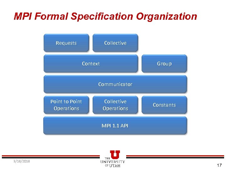 MPI Formal Specification Organization Requests Collective Context Group Communicator Point to Point Operations Collective Operations Constants MPI 1. 1 API 3/18/2018 17