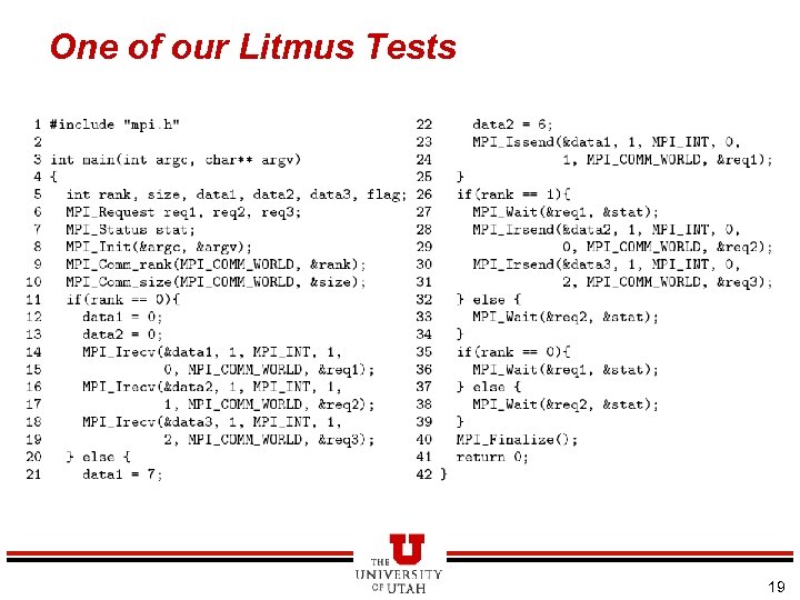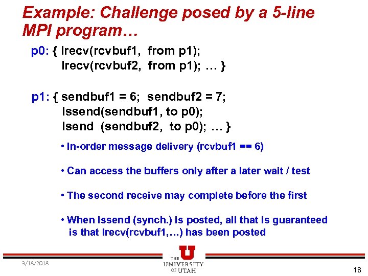 Example: Challenge posed by a 5 -line MPI program… p 0: { Irecv(rcvbuf 1, from p 1); Irecv(rcvbuf 2, from p 1); … } p 1: { sendbuf 1 = 6; sendbuf 2 = 7; Issend(sendbuf 1, to p 0); Isend (sendbuf 2, to p 0); … } • In-order message delivery (rcvbuf 1 == 6) • Can access the buffers only after a later wait / test • The second receive may complete before the first • When Issend (synch. ) is posted, all that is guaranteed is that Irecv(rcvbuf 1, …) has been posted 3/18/2018 18