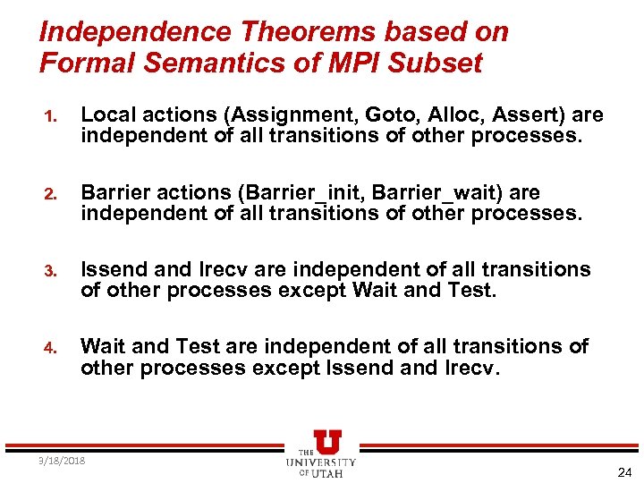 Independence Theorems based on Formal Semantics of MPI Subset 1. Local actions (Assignment, Goto, Alloc, Assert) are independent of all transitions of other processes. 2. Barrier actions (Barrier_init, Barrier_wait) are independent of all transitions of other processes. 3. Issend and Irecv are independent of all transitions of other processes except Wait and Test. 4. Wait and Test are independent of all transitions of other processes except Issend and Irecv. 3/18/2018 24