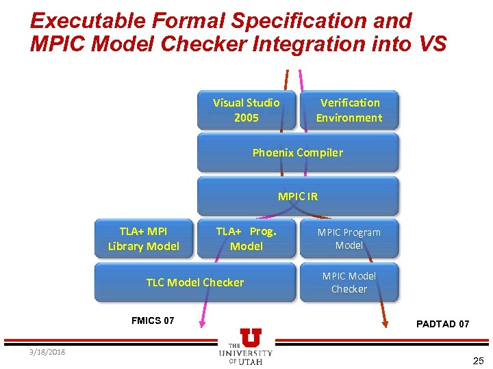 Executable Formal Specification and MPIC Model Checker Integration into VS Visual Studio 2005 Verification Environment Phoenix Compiler MPIC IR TLA+ MPI Library Model TLA+ Prog. Model TLC Model Checker FMICS 07 3/18/2018 MPIC Program Model MPIC Model Checker PADTAD 07 25