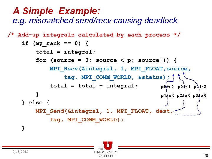 A Simple Example: e. g. mismatched send/recv causing deadlock /* Add-up integrals calculated by each process */ if (my_rank == 0) { total = integral; for (source = 0; source < p; source++) { MPI_Recv(&integral, 1, MPI_FLOAT, source, tag, MPI_COMM_WORLD, &status); total = total + integral; p 0: fr 0 p 0: fr 1 p 0: fr 2 } p 1: to 0 p 2: to 0 p 3: to 0 } else { MPI_Send(&integral, 1, MPI_FLOAT, dest, tag, MPI_COMM_WORLD); } 3/18/2018 26