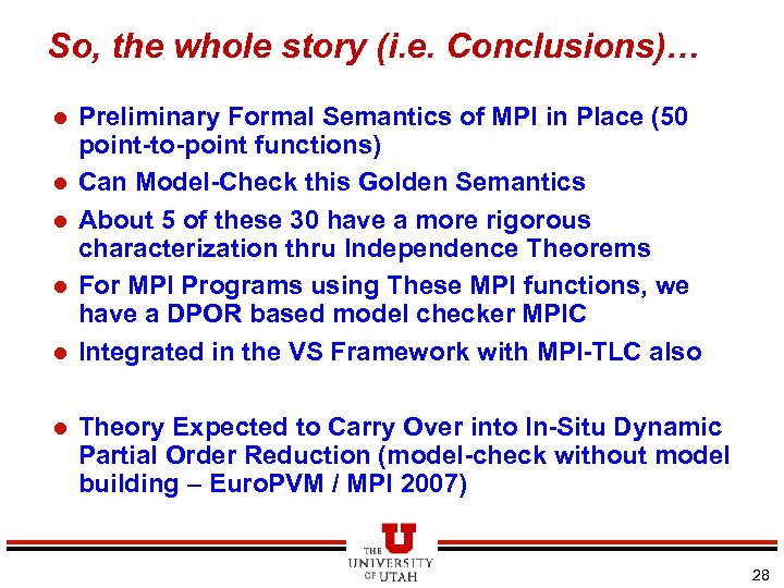 So, the whole story (i. e. Conclusions)… l l l Preliminary Formal Semantics of MPI in Place (50 point-to-point functions) Can Model-Check this Golden Semantics About 5 of these 30 have a more rigorous characterization thru Independence Theorems For MPI Programs using These MPI functions, we have a DPOR based model checker MPIC Integrated in the VS Framework with MPI-TLC also Theory Expected to Carry Over into In-Situ Dynamic Partial Order Reduction (model-check without model building – Euro. PVM / MPI 2007) 28