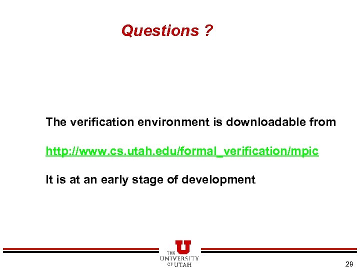 Questions ? The verification environment is downloadable from http: //www. cs. utah. edu/formal_verification/mpic It is at an early stage of development 29