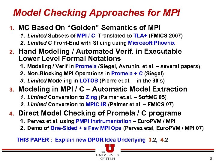 Model Checking Approaches for MPI l MC Based On “Golden” Semantics of MPI Limited Subsets of MPI / C Translated to TLA+ (FMICS 2007) Limited C Front-End with Slicing using Microsoft Phoenix l Hand Modeling / Automated Verif. in Executable Lower Level Formal Notations Modeling / Verif in Promela (Siegel, Avrunin, et. al. – several papers) Non-Blocking MPI Operations in Promela + C (Siegel) Limited Modeling in LOTOS (Pierre et. al. – in the 90’s) l Modeling in MPI / C – Automatic Model Extraction Limited Conversion to Zing (Palmer et. al. – Soft. MC 05) Limited Conversion to MPIC-IR (Palmer et. al. – FMICS 07) l Direct Model Checking of Promela / C programs Pervez et. al. using PMPI Instrumentation – Euro. PVM / MPI Demo of One-Sided + a Few MPI Ops (Pervez etal, Euro. PVM / MPI 07) 5
