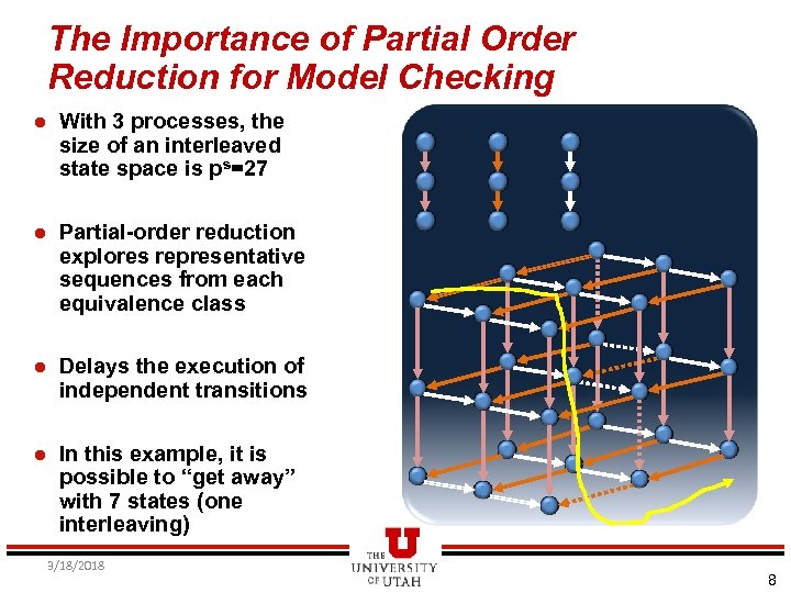The Importance of Partial Order Reduction During Model Checking l With 3 processes, the size of an interleaved state space is ps=27 l Partial-order reduction explores representative sequences from each equivalence class l Delays the execution of independent transitions 3/18/2018 7