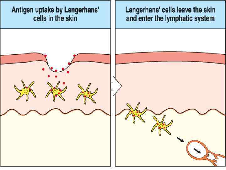 Иммундық жауаптың қалыптасуында Лангерганс жасушалары ерекше орын алады: • • • 1) Зақымдалған тері арқылы енген антигендерді Лангерганс жасушалары жұтады, себебі олардың фагоцитарлық белсенділігі бар, бірақ олар В 7 костимуляторын экспрессияламайды. 2) Лангерганс жасушалары лимфа тамырлары арқылы жақын орналасқан лимфа түйініне келеді. Бұл аймақта Лангерганс жасушалары В 7 корецепторын экспрессиялайтын дендритті жасушаға дифференцияланады. 3) CD 8 -лимфоциттер мен CD 4 -лимфоциттердің иммундық жауапқа қосылуына жағдай туады.