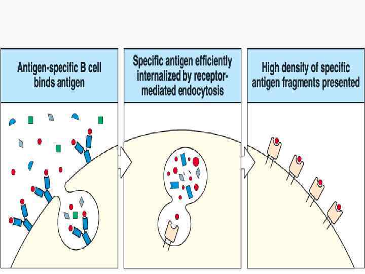Бетінде II класс МНС молекулалары үлкен мөлшерде экспрессияланған Влимфоциттер де антигентаныстырушы жасуша бола алады. В-лимфоциттердің беткей иммуноглобулиндері 2 қызмет атқарады: • 1) антигенді детерминанттарды (гаптендерді) арнайы байланыстыру • 2) түзілген иммундық кешендердің эндоцитозы