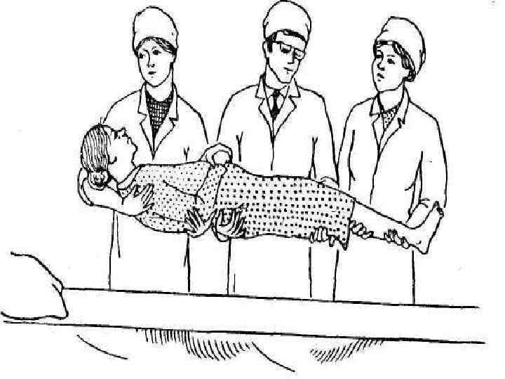 Науқасты кушеткадан каталкаға және кері жатқызу кезінде үшеулеген қолайлы болады. 1. Каталканы кушеткаға көлденең қойыңыз каталканың бас жағын кушетканың аяқ жағына 2. Үшеуі де науқастың бір жағында тұрады: а) біреуі - науқастың басы мен жауырыны астына қолдарын салады; ә) екіншісі - жамбас пен санның жоғарғы жағынан; б) үшіншісі - санның орта жағынан және балтырынан