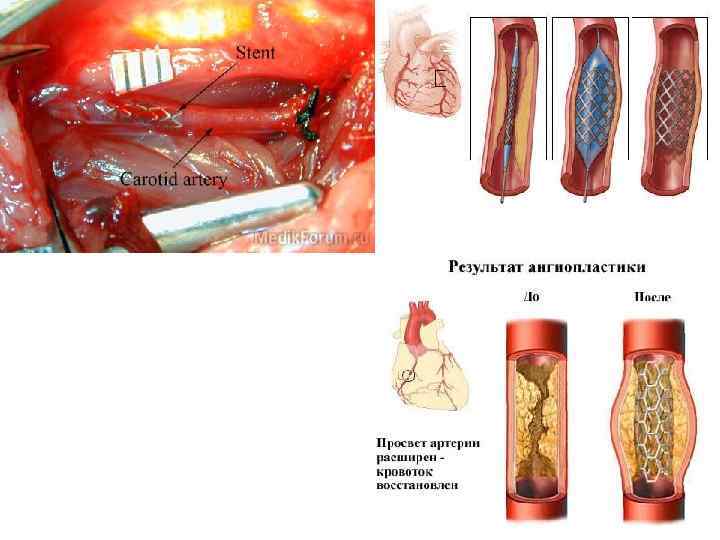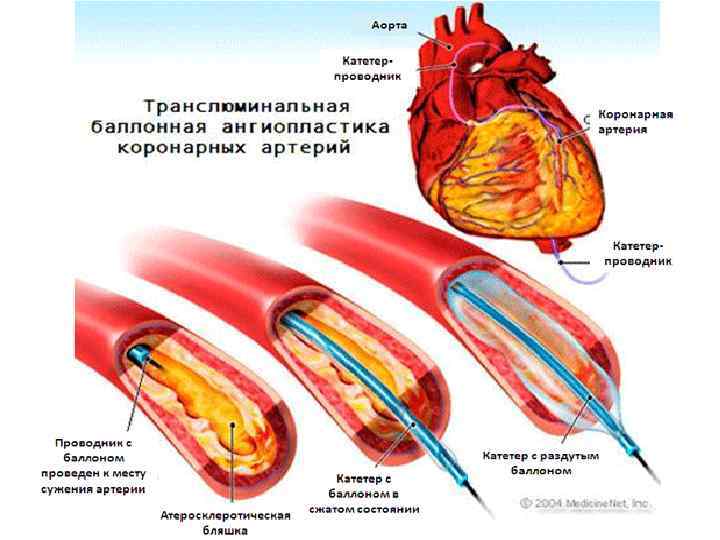 Теріішілік транслюминальды коронарлы ангиопластика: v Бағыттаушы катетер сан немесе қол артериясына қойылып, ішіндегі жіңішке металл түтікше бітелген коронарлы артерия аймағына тығылады. Түтікше басындағы шар, бітелген аймаққа келгенде үрленіп, бітелген артерия өзегін кеңейтеді. Содан кейін түтікше қантамыр ішінде қалады да, ал катетер мен шар алынып тасталады. v Нәтижесі: бітелген артерия өзегін ашады, қанайналым қалпына келеді және симптомдар жойылады. Бірақ атеросклероз процессін толық тоқтатпайды. Сол үшін науқас профилактикалық дәрілер ішуі тиіс. Сол үшін стенттау жиі қолданады. v Асқынуы: атеросклеротикалық түйіндердің қайта қантамыр өзегін бітеуі. Операция қайта жасауға тура келеді.