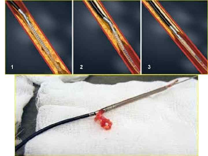 Тікелей атероэктомия Ротационды атероэктомия • Әктенбеген бляшка кезінде қолд • Аорт төм бөл. ж/е бифуркацияда • Әктенген, ұз 20 мм бляшка кез-де • Алмазды наконечнигі бар бур ар-ы бляшканы құмға айн-ы