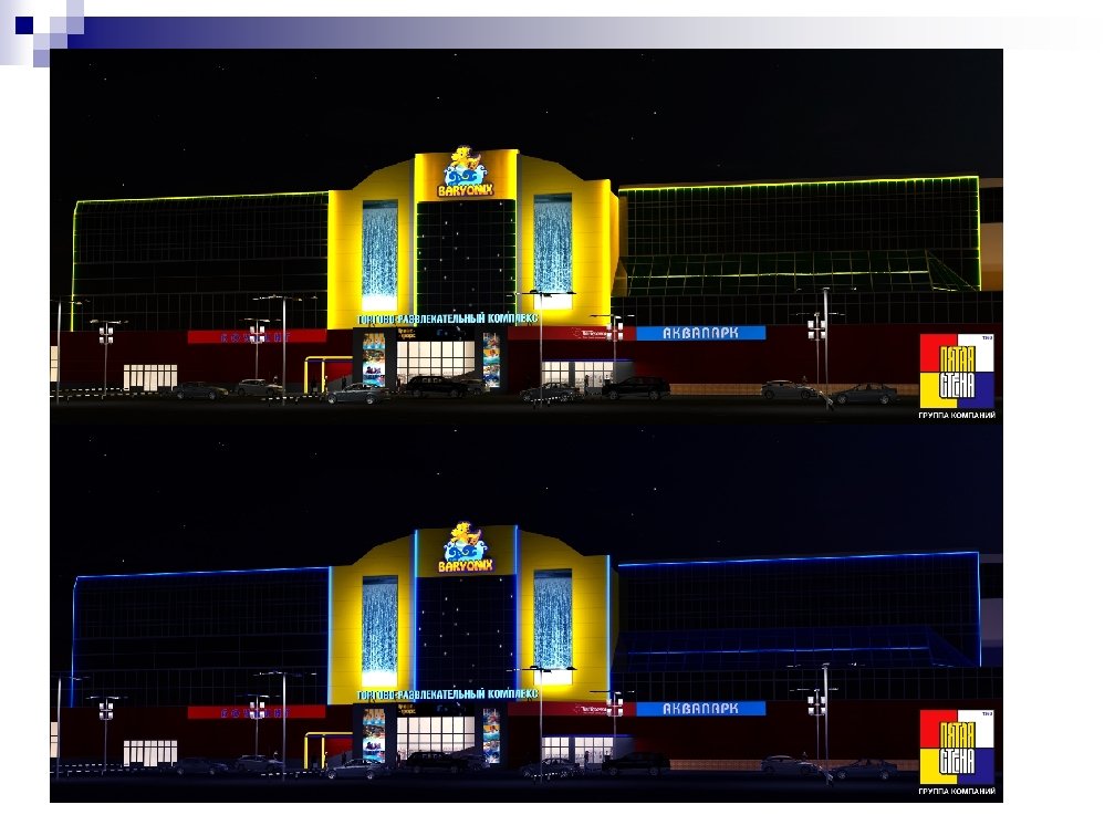 ОПИСАНИЕ КОНЦЕПЦИИ Наш центр лучший друг семьи! Сделать отдых разнообразным, интересным и полезным, помочь семьям проводить больше времени вместе, а значит стать сплоченнее и крепче – вот главная миссия нашего центра! Отличительной чертой комплекса должна стать УНИКАЛЬНОСТЬ – размещение под одной крышей увлекательных и разнообразных видов развлечений для всех членов семьи. Технические характеристики комплекса • Полностью управляемая система кондиционирования здания с независимыми контролируемыми зонами на каждом этаже • Обогрев по периметру с индивидуальным температурным контролем • Противопожарная система, соответствующая международным стандартам • Система фильтрации и стерилизации воды • Система воздухоочистки • Автономное снабжение горячей водой • Подвод коммуникаций на каждый этаж • Высокоскоростные лифты с большой грузоподъемностью • Охраняемая парковка Общая площадь Общий размер арендопригодных площадей (без учета аквапарка, боулинга, Трансфорс) 7 446 кв. м. Предполагаемая плата за арендуемую площадь 300 руб. /кв. м. в месяц Предполагаемое заполнение комплекса (синим выделены существующие объекты) 1 этаж Ресторан TRANS-FORCE Роллердром Семейный игровой центр Магазин детской одежды Магазин игрушек Медицинский центр 2 этаж Аквапарк BARYONIX Ресторанный двор Йога центр + студия танцев Интернет кафе Устроение Wi. Fi-зоны Медицинский центр 3 этаж Боулинг Мини-отель Банный комплекс 3 -х уровневый ресторан Скалодром Релакс зона 4 этаж Интехбанк