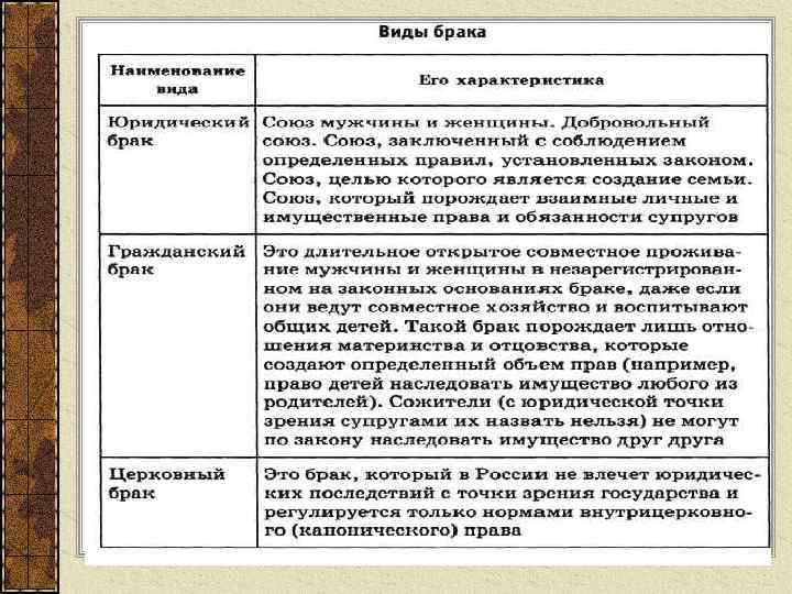 4. Брак Как добровольный союз между мужчиной и женщиной с целью создания семьи– регулирует семейные отношения, права и обязанности супругов Характеристики брака: v Брак – это союз мужчины и женщины. В России признаются только разнополые браки. v Цель брака – создание семьи. Брак, заключённый без намерения создать семью, а только из корыстных побуждений называется фиктивным и поэтому признаётся недействительным. v Брак – это союз, зарегистрированный в органах ЗАГСа (записи актов гражданского состояния) v Брак – это такой союз, который порождает между супругами юридические права и обязанности