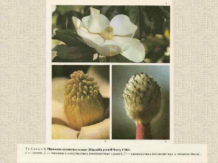 Главные признаки ü Плод сложный, состоящий из многочисленных, 1— 2 семянных или больше, одногнездных плодиков, расположенных на удлинённом или головчатом сухом или сочном цветоложе. Магнолия крупноцветковая (Magnolia grandiflora) : 1 - продольный разрез через цветок (т - тычинки; п - пестики); 2 - плод из многих листовок, вскрывающихся по спинному шву.