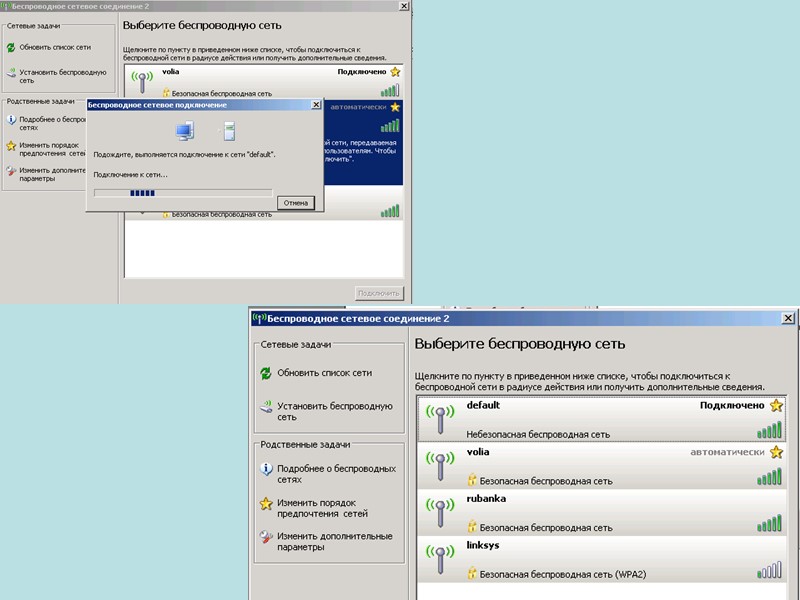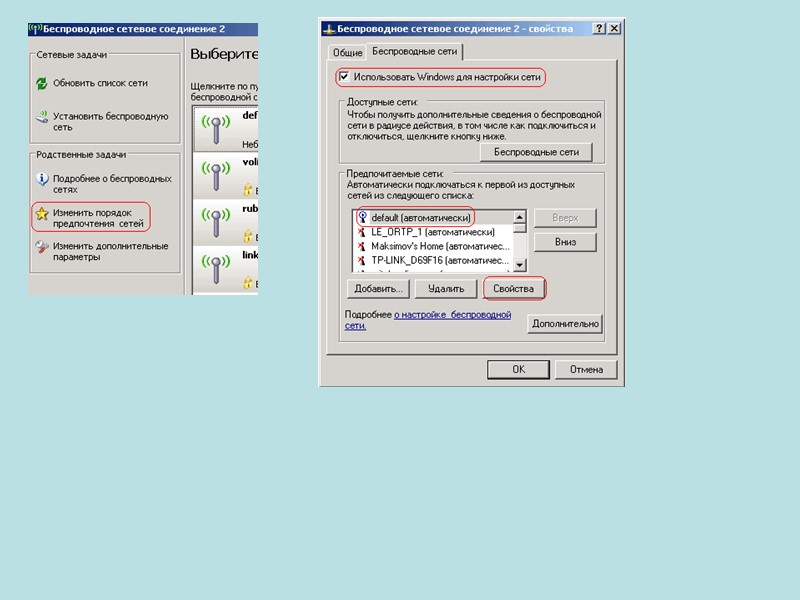 Для настройки и управления беспроводным соединением, в Windows XP есть соответствующая утилита Ищет беспр.сети в радиусе действия Изменение списка/доп.параметров сети