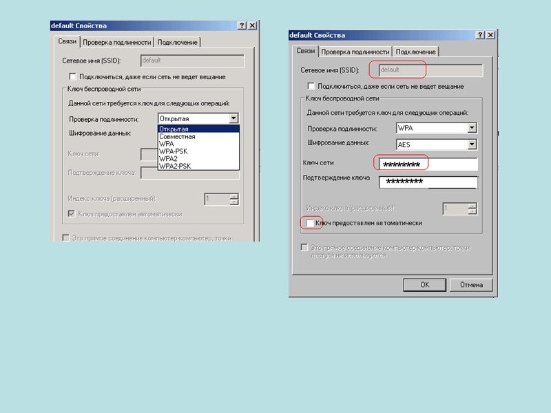 Выбор режима шифрования Наименее безопасный режим шифрования- WEP WPA2 с алгоритмом AES на данный момент является наиболее надежным вариантом шифрования. (К сожалению, не поддерживается рядом устаревших устройств, к примеру на Windows XP или Windows Mobile 5.0(и ниже) Для дополнительной защиты можно включить ограничение на подключение по МАС-адресу, использовать неширокополосную сеть, VPN