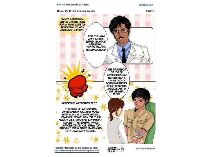Computerized Semen Test • Sperm test for morphology The appearance of sperm under a microscope is used as a sperm test. All men, in a semen specimen, will have some sperm with a normal appearance and some with an abnormal appearance. In men with normal fertility, a certain percentage of the sperm will have a normal appearance. . • • • Other types of male fertility tests Endocrine (Hormone) Evaluation: Normal sperm production and sexual function are dependent on a normal hormonal environment. An endocrine evaluation should be performed if a sperm test reveals: low sperm concentration low sperm motility The male hormone evaluation includes measurement of Follicle stimulating hormone (FSH) Luteinizing hormone (LH) Testosterone Estradiol Prolactin Thyroid function Liver function • Additional Semen Tests They are no longer considered to be part of the standard male fertility test. Antisperm antibodies • Semen fructose – the absence of fructose, a sugar-like substance in the semen, means either the vas deferens are obstructed or that the seminal vesicles are absent. • Peroxidase staining – differentiates white blood cells from immature sperm to assess for possible infection. • Sperm penetration assay (Hamster egg penetration test) • Human zona pellucida binding test – measures the ability of sperm to bind to the zona pellucida (outer covering) of the egg. This test is also called the hemizona assay. • Sperm DNA fragmentation testing • • • Specialized Semen Tests These tests may be useful in a small number of patients for under certain special circumstances Hypo-osmotic swelling test – assesses the sperm membrane for structural integrity. Semen culture – checks for bacteria that may cause genital infection. Vital staining – determines numbers of living and dead sperm. • • Genetic Evaluation The importance of genetic evaluation in infertile males with severe oligospermia (sperm counts of less than 5 to 10 million per ejaculate) or nonobstructive azoospermia (absence of sperm in semen, not due to blockage) has recently been established. These patients may have abnormalities in the number of chromosomes ( karyotype) or abnormalities in the structure of the male chromosome ( microdeletion of the Ychromosome). Patients with azoospermia as a result of being born without two vas deferens frequently have a mutation of a gene responsible for the disease cystic fibrosis but do not have the disease itself.
