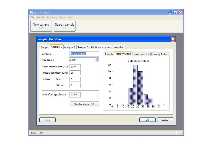 Part III Semen abnormalities • • • • Nomenclature related to semen quality Aspermia - no semen (no or retrograde ejaculation). Asthenozoospermia - percentage of progressively motile spermatozoa (A+B classes) below the lower reference limit. Asthenoteratozoospermia - percentages of both progressively motile (A+B classes) and morphologically normal spermatozoa below the lower reference limits. Azoospermia - no spermatozoa in the ejaculate. Cryptozoospermia - spermatozoa absent from fresh preparations but observed in a centrifuged pellet. Haemospermia (haematospermia) - presence of erythrocytes in the ejaculate. Leukospermia (leukocytospermia, pyospermia) - presence of leukocytes in the ejaculate above threshold value. Necrozoospermia - low percentage of live, and high percentage of immotile, spermatozoa in the ejaculate. Normozoospermia - total number or concentration of spermatozoa, and percentages of progressively motile (A+B classes) and morphologically normal spermatozoa, equal to or above the lower reference limits. Oligoasthenozoospermia - total number or concentration of spermatozoa, and percentages of progressively motile (A+B classes), below the lower reference limits. Oligoasthenoteratozoospermia - total number or concentration of spermatozoa, and percentages of both progressively motile (A+B classes)and morphologically normal spermatozoa, below the lower reference limits. Oligoteratozoospermia - total number or concentration of spermatozoa, and percentage of morphologically normal spermatozoa, below the lower reference limits. Oligozoospermia - total number or concentration of spermatozoa below the lower reference limit. Teratozoospermia - percentage of morphologically normal spermatozoa below the lower reference limit. • • • Main soft ware features Automated analysis of sperm concentration and motility on native samples according to WHO recommendations. Automated morphology analysis on stained samples according to strict Krueger’s criteria. Manual assessment of concentration of white blood cells, immature germ cells, round cells. Manual measurements for special research or other individual tasks.