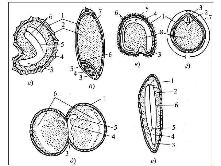Олимпиадникам. Что обозначено на рисунке цифрами 1 – 8? 1. 2. 3. 4. 5. 6. 7. 8. Семенная кожура; Зародышевый корешок; Зародышевый стебелек; Зародышевая почечка; Две семядоли; Эндосперм; Перисперм; Околоплодник, сросшийся с семенной кожурой.