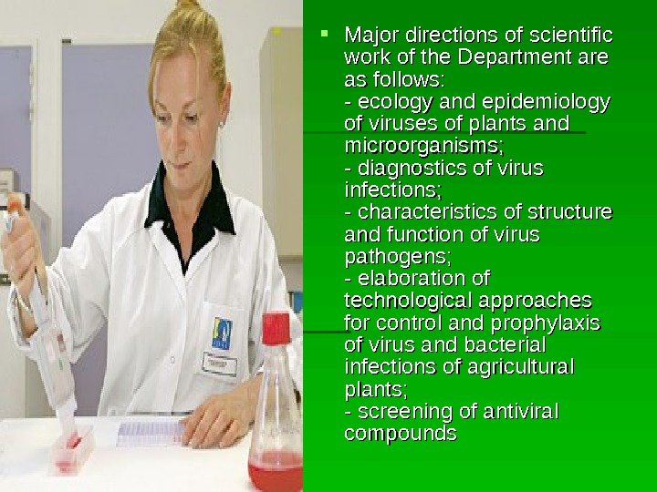 Major directions of scientific work of the Department are as follows: — ecology and epidemiology of viruses of plants and microorganisms; — diagnostics of virus infections; — characteristics of structure and function of virus pathogens; — elaboration of technological approaches for control and prophylaxis of virus and bacterial infections of agricultural plants; — screening of antiviral compounds