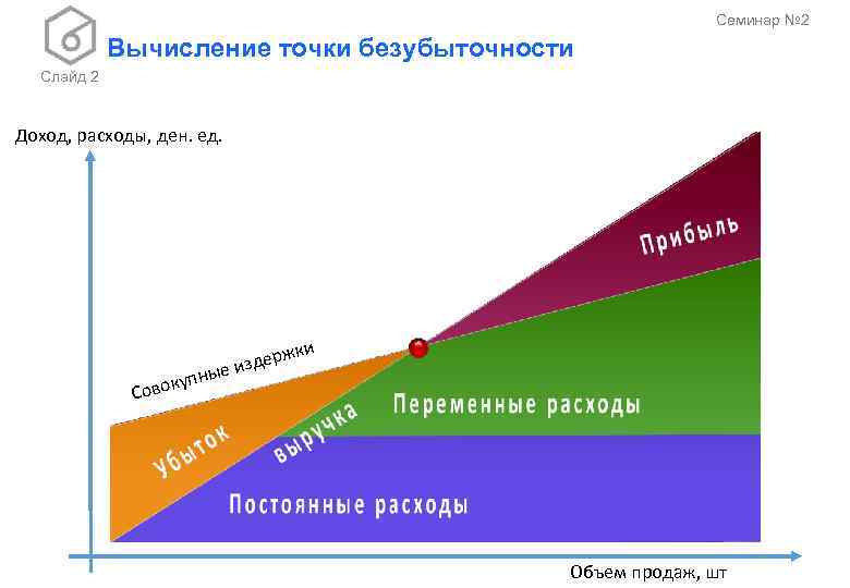 Семинар № 2 Вычисление точки безубыточности Слайд 1 Точка безубыточности в денежном выражении — такая минимальная величина дохода, при которой полностью окупаются все издержки (прибыль при этом равна нулю): , где BEP (англ. break-even point) — точка безубыточности, FC (англ. total fixed costs) — величина постоянных издержек, VC (англ. unit average variable costs) — величина переменных издержек на единицу продукции, P (англ. unit sale price) — стоимость единицы продукции (реализация), C (англ. unit contribution margin) — прибыль с единицы продукции без учёта доли постоянных издержек (разница между стоимостью продукции (P) и переменными издержками на единицу продукции (VC)). Можно заметить, что выражение C/P численно равно отношению валовой маржи к выручке.