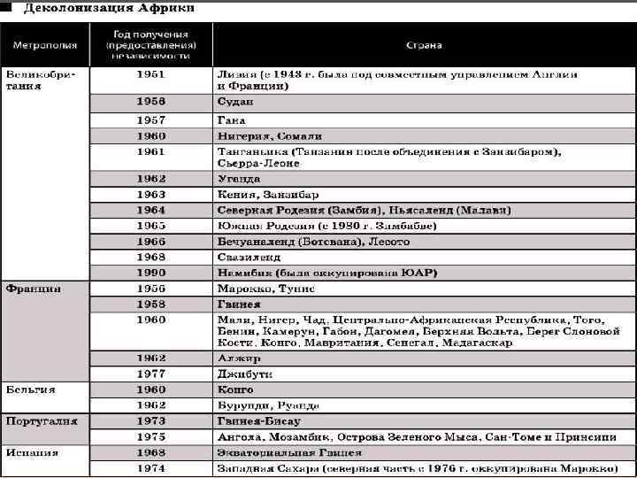 Этапы деколонизации: Этапы деколонизации • Первый этап 1943 - 1956 Охватил главным образом Азию и Северную Африку Второй этап конец 50 -х - 60 -е гг. Охватил в основном Африку Третий этап 70 -е гг. Падение португальской колониальной империи Четвертый этап 80 -е - 90 -е гг. Обретение независимости оставшимися колониями • • •