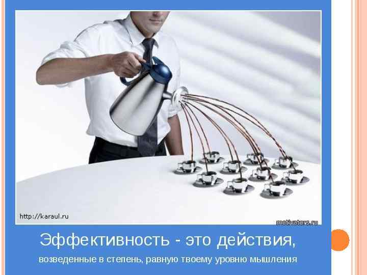 УСЛОВИЯ ЭФФЕКТИВНОСТИ МЕНЕДЖЕРА ü ü ü ü Планирование своей текущей деятельности + 10% времени; Стратегическое планирование + 20 -40 % времени; Делегирование + 5 -15% времени, + 10 -30% прибыли; Правильное мотивирование подчиненных – 10 -100% расходов на оплату труда; Правильная организация производственного процесса – 2050% издержек, + 10 -300% прибыли (в условиях России); Системность в работе с информацией + 5 -20% времени; Личные коммуникации менеджера +50% времени, + увеличение доходов в разы, обеспечение будущих доходов; Работа консультанта + 10 -20 % прибыли.