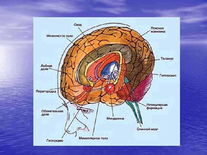 1. 2. 3. 4. 5. 6. 7. Гипоталамус отвечает за сильные эмоции Миндалина отвечает за агрессивное поведение и страх Гиппокамп отвечает за агрессию и страх Ретикулярная формация выполняет функция фильтра ( фильтрует эмоции) Голубое пятно – выработка норадреналина, который запускает депрессию если его не хватает, а ели в избытке – стресс) Черная субстанция – вырабатывает дофамин – гормон радости Кора головного мозга отвечает за высшие эмоции, сдерживание эмоций.