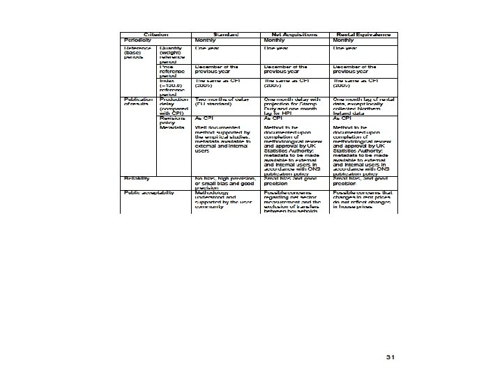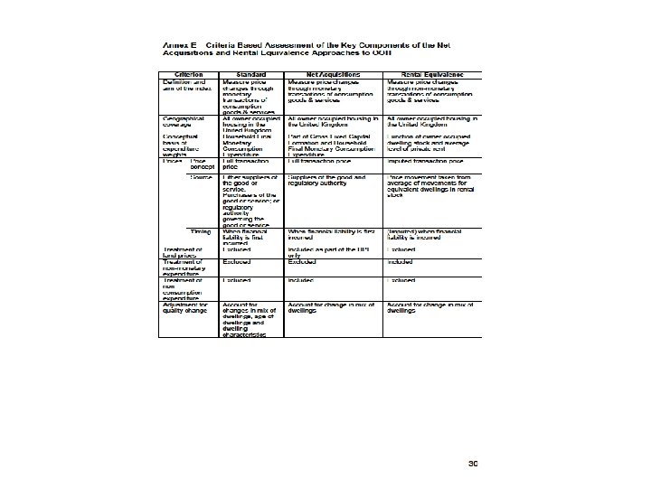 Owner-occupier housing costs – the HICP: UK experience • Rental equivalence approach should be used. – A better match against the quality criteria for a measure of OOH in CPIH. – Rental equivalence index meets most of the evaluation criteria as set out in the table in – Annex E of paper CPAC (12)14. – Except for the inclusion of imputed prices. • But is a compromise.