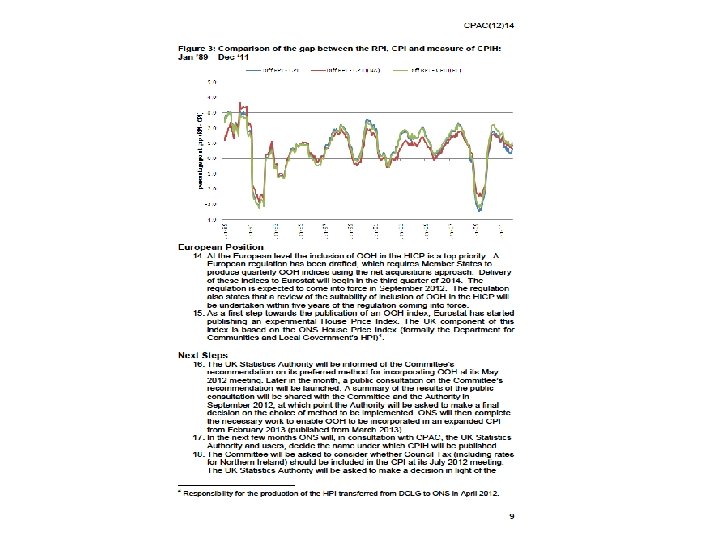 Owner-occupier housing costs – the HICP: UK experience • Recommendation of UK Consumer Prices Advisory Committee in 2012. – Office for National Statistics (ONS) implements the rental equivalence approach to measure owner occupiers’ housing costs in a new additional measure of consumer price inflation (CPIH) introduced from February 2013, published in March 2013. – CPIH should be published alongside the existing measures of consumer price inflation (i. e. CPI and RPI). – Coverage of CPIH to be extended to include council tax, when it is introduced in early 2013. • Not to be applied to the existing CPI (i. e. HICP), since Eurostat has decided that Council Tax should not be included in the HICP. • Strategy for consumer price statistics endorsed by UK Statistics Authority - welcomed a CPIH developed to meet needs of users (a priority for Bank of England & HM Treasury).