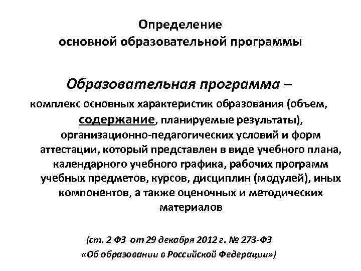 Определение основной образовательной программы Образовательная программа – комплекс основных характеристик образования (объем, содержание, планируемые результаты), организационно-педагогических условий и форм аттестации, который представлен в виде учебного плана, календарного учебного графика, рабочих программ учебных предметов, курсов, дисциплин (модулей), иных компонентов, а также оценочных и методических материалов (ст. 2 ФЗ от 29 декабря 2012 г. № 273 -ФЗ «Об образовании в Российской Федерации» )