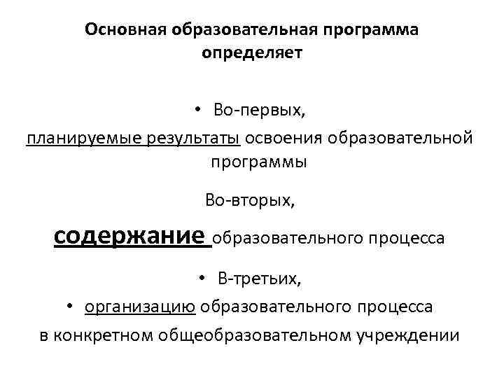 Основная образовательная программа определяет • Во-первых, планируемые результаты освоения образовательной программы Во-вторых, содержание образовательного процесса • В-третьих, • организацию образовательного процесса в конкретном общеобразовательном учреждении