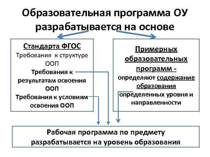 Образовательная программа ОУ разрабатывается на основе Стандарта ФГОС Требования к структуре ООП Требования к результатам освоения ООП Требования к условиям освоения ООП Примерных образовательных программ - определяют содержание образования определенных уровня и направленности Рабочая программа по предмету разрабатывается на уровень образования