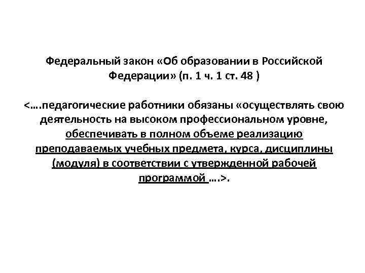 Федеральный закон «Об образовании в Российской Федерации» (п. 1 ч. 1 ст. 48 ) <…. педагогические работники обязаны «осуществлять свою деятельность на высоком профессиональном уровне, обеспечивать в полном объеме реализацию преподаваемых учебных предмета, курса, дисциплины (модуля) в соответствии с утвержденной рабочей программой …. >.