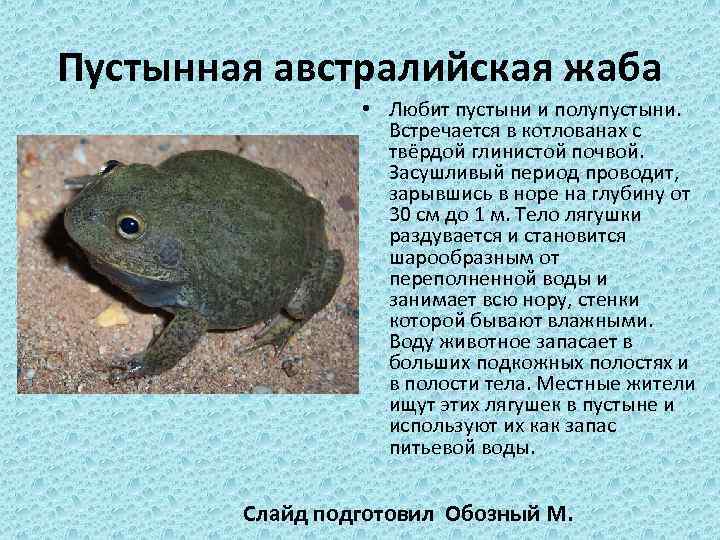 Пустынная австралийская жаба • Любит пустыни и полупустыни. Встречается в котлованах с твёрдой глинистой почвой. Засушливый период проводит, зарывшись в норе на глубину от 30 см до 1 м. Тело лягушки раздувается и становится шарообразным от переполненной воды и занимает всю нору, стенки которой бывают влажными. Воду животное запасает в больших подкожных полостях и в полости тела. Местные жители ищут этих лягушек в пустыне и используют их как запас питьевой воды. Слайд подготовил Обозный М.