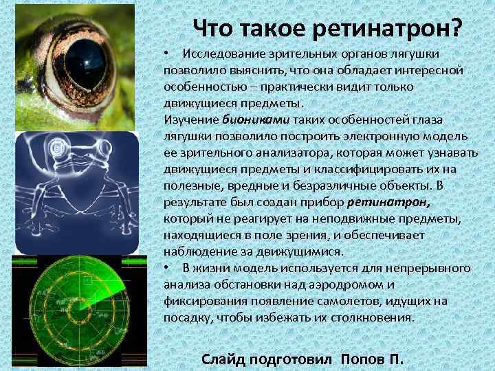 Что такое ретинатрон? • Исследование зрительных органов лягушки позволило выяснить, что она обладает интересной особенностью – практически видит только движущиеся предметы. Изучение биониками таких особенностей глаза лягушки позволило построить электронную модель ее зрительного анализатора, которая может узнавать движущиеся предметы и классифицировать их на полезные, вредные и безразличные объекты. В результате был создан прибор ретинатрон, который не реагирует на неподвижные предметы, находящиеся в поле зрения, и обеспечивает наблюдение за движущимися. • В жизни модель используется для непрерывного анализа обстановки над аэродромом и фиксирования появление самолетов, идущих на посадку, чтобы избежать их столкновения. Слайд подготовил Попов П.