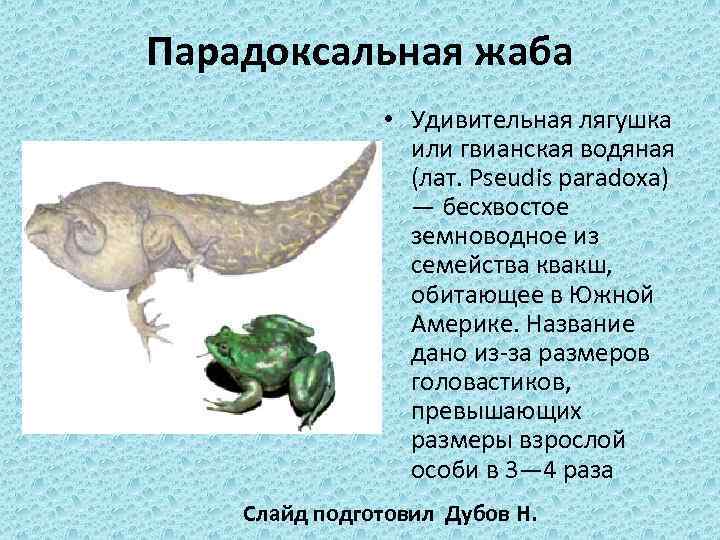 Парадоксальная жаба • Удивительная лягушка или гвианская водяная (лат. Pseudis paradoxa) — бесхвостое земноводное из семейства квакш, обитающее в Южной Америке. Название дано из-за размеров головастиков, превышающих размеры взрослой особи в 3― 4 раза Слайд подготовил Дубов Н.