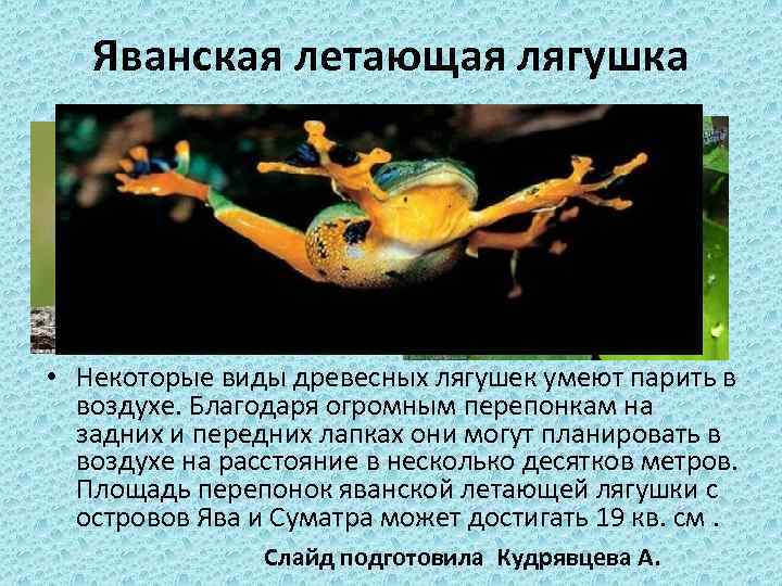 Яванская летающая лягушка • Некоторые виды древесных лягушек умеют парить в воздухе. Благодаря огромным перепонкам на задних и передних лапках они могут планировать в воздухе на расстояние в несколько десятков метров. Площадь перепонок яванской летающей лягушки с островов Ява и Суматра может достигать 19 кв. см. Слайд подготовила Кудрявцева А.