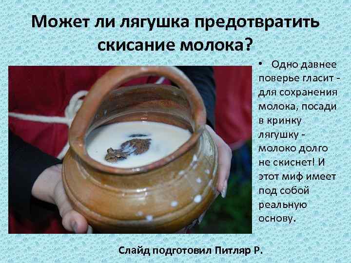 Может ли лягушка предотвратить скисание молока? • Одно давнее поверье гласит для сохранения молока, посади в кринку лягушку молоко долго не скиснет! И этот миф имеет под собой реальную основу. Слайд подготовил Питляр Р.
